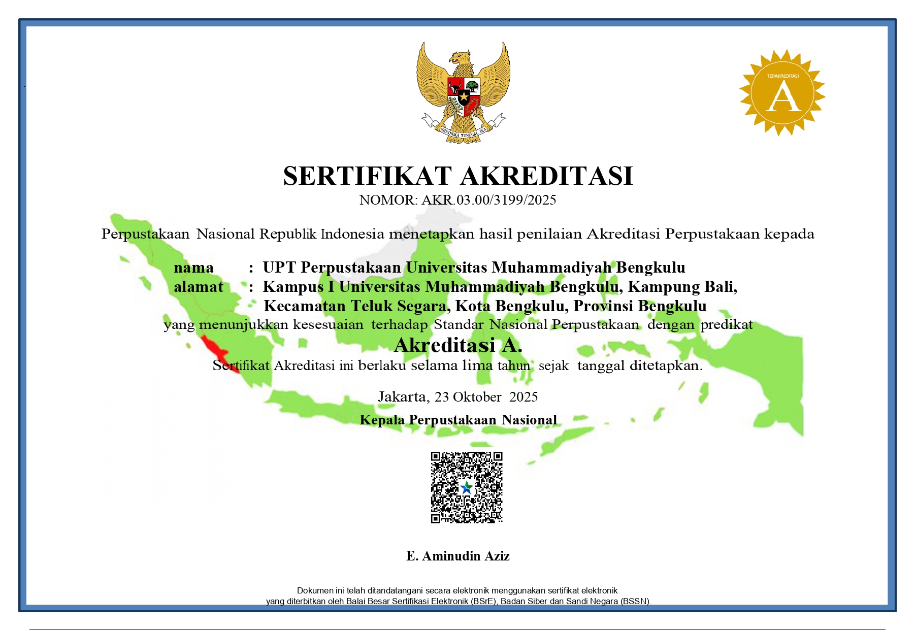 Perpustakaan Universitas Muhammadiyah Bengkulu resmi mempertahankan predikat Akreditasi A (Unggul) dari Perpustakaan Nasional RI untuk periode 2025β2029.