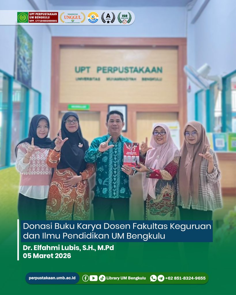 Terimakasih atas sumbangan buku yang diberikan oleh Dosen Universitas Muhammadiyah Bengkulu Bapak Dr. Elfahmi Lubis, S.H., M.Pd Dosen Fakultas Keguruan dan Ilmu Pendidikan Universitas Muhammadiyah Bengkulu pada Rabu, 05 Maret 2026.