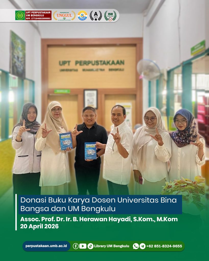 Terimakasih atas sumbangan buku yang diberikan oleh Assoc. Prof. Dr. Ir. B. Herawan Hayadi, S.Kom., M.Kom (Dosen Universitas Bina Bangsa), Bapak RG Guntur Alam, M.Kom., Ph.D., dan Ibu Dr. Yulia Darmi, S.Kom, M.Kom (Dosen Universitas Muhammadiyah Bengkulu) pada Senin, 20 April 2026.