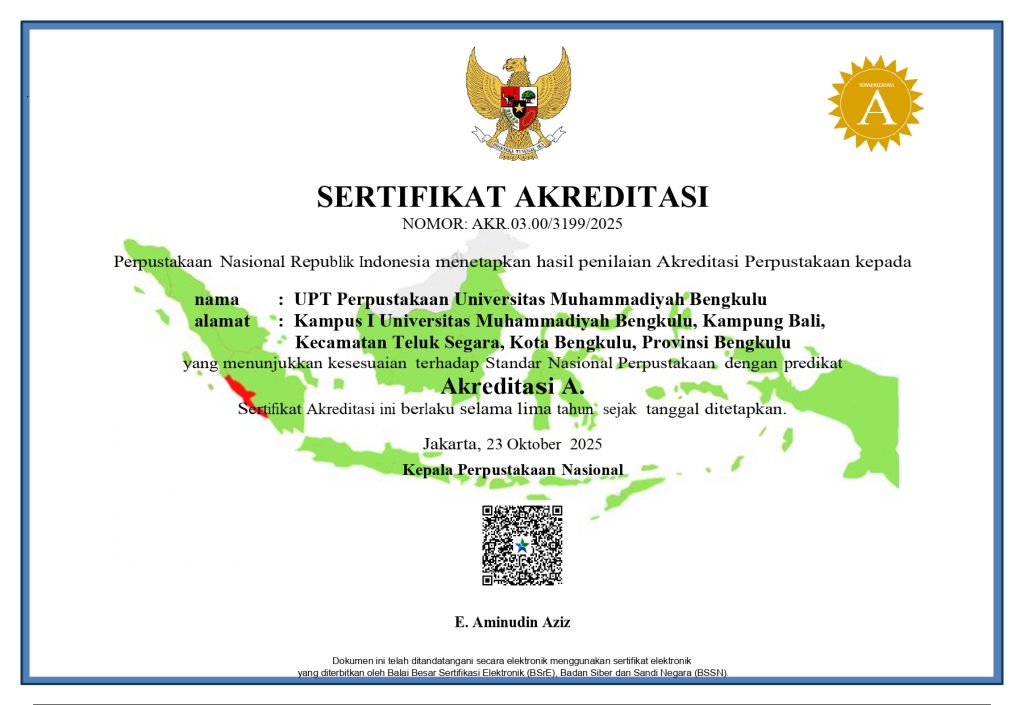 Sertifikat Akreditasi UPT Perpustakaan Universitas Muhammadiyah Bengkulu Sertifikat Akreditasi UPT PERPUSTAKAAN UM BENGKULU Tahun 2025 Sertifikat Akreditasi UPT PERPUSTAKAAN UM BENGKULU Tahun 2021